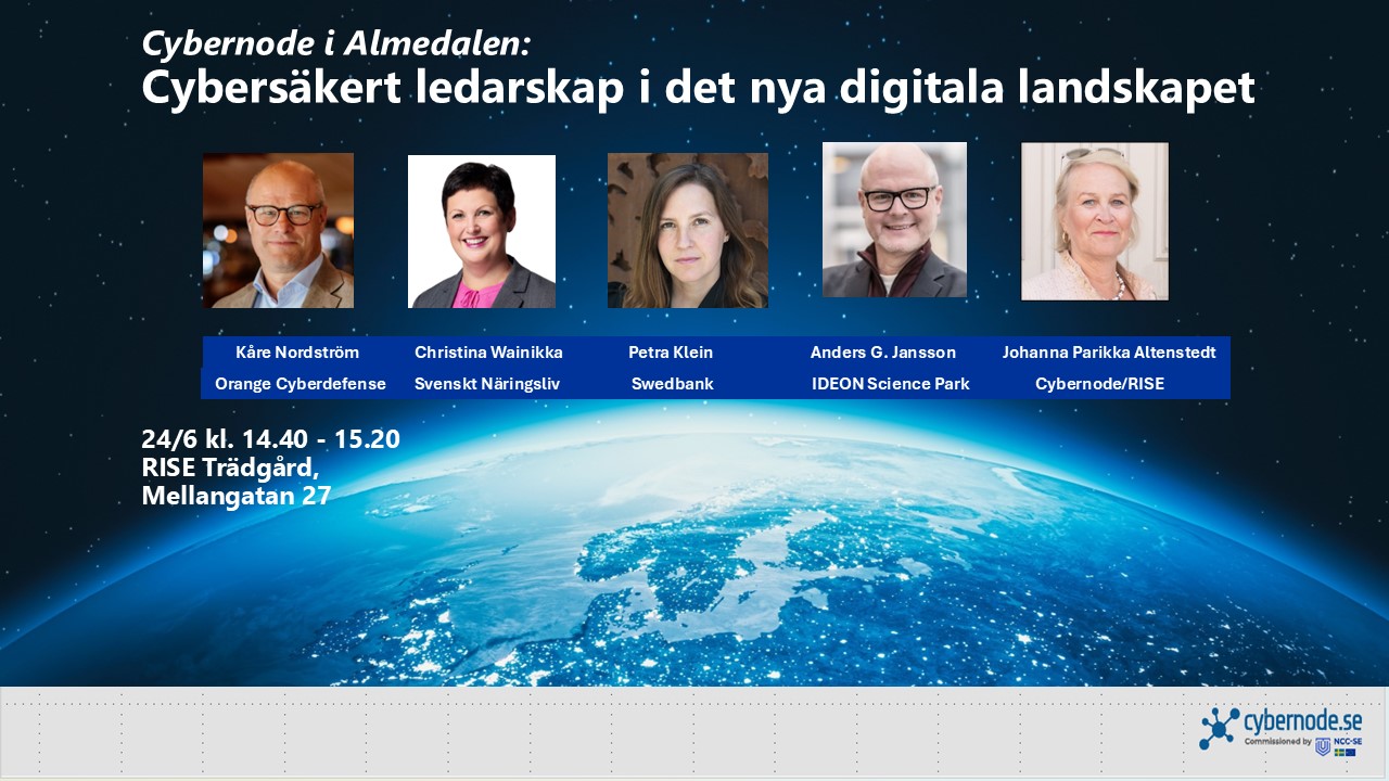 Kom och lyssna på group CSO och koncernsäkerhetschef, Swedbank Petra Klein, VD på Ideon Science Park Lund, Anders G Nilsson, docent i civilrätt och policyexpert för immaterialrätt vid Svenskt Näringsliv, Christina Wainikka, samt Orange Cyberdefence VD i Sverige, Kåre Nordström om vilka nya förmågor som krävs av organisationsledare för att leda cybersäkerhetsarbetet under såväl vardagen, i kris och vid höjd beredskap, moderator är Johanna Parikka Altenstedt från RISE och Cybernoden.